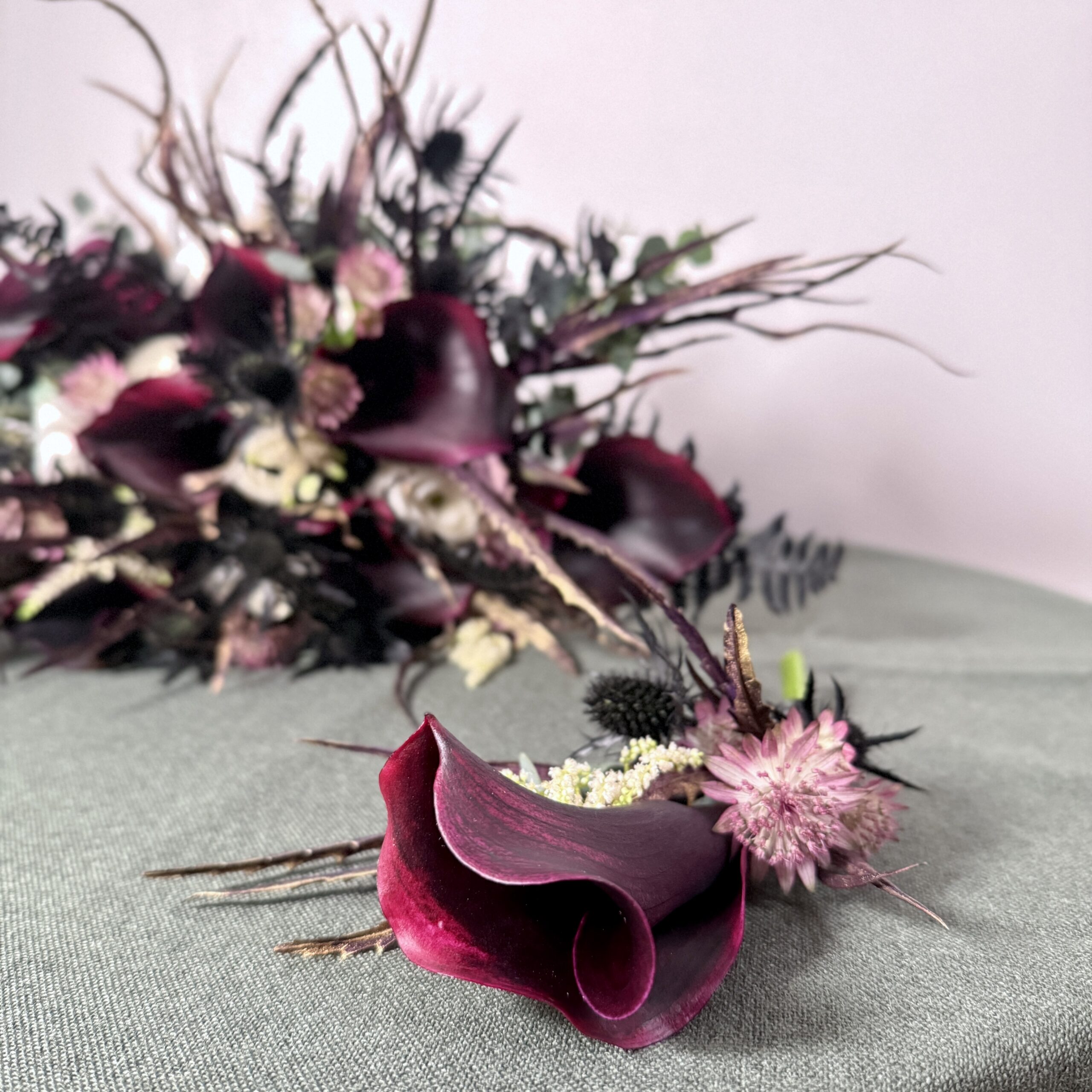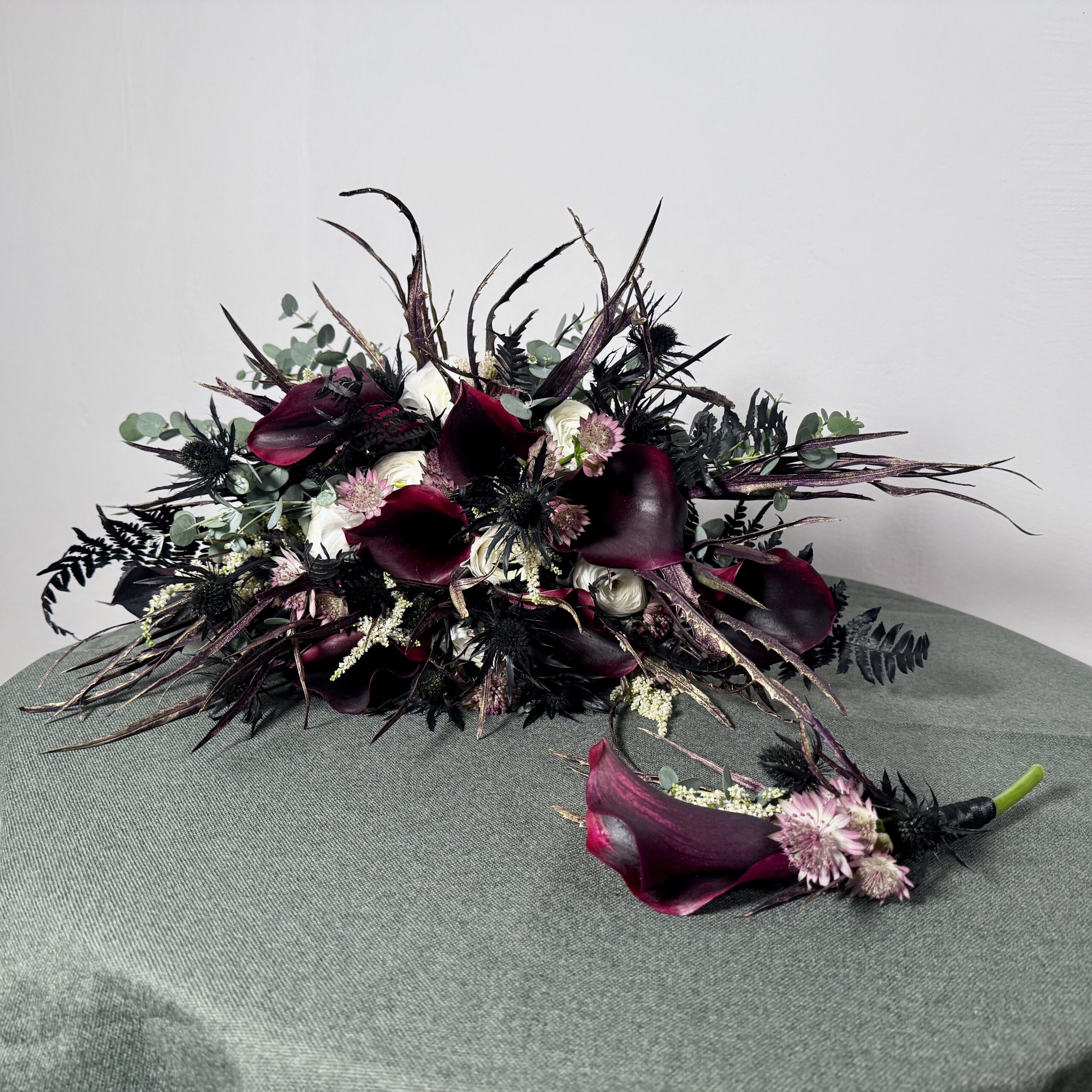 Tajuplné, temné a divoké. Takové bylo zadání na tuhle jedinečnou kytici z tmavě červených až fialových kal. Ideální pro fialovu goth queen, co nosí zlaté doplňky.